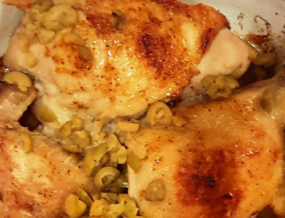 Whisk together the remaining ingredients EXCEPT for the chopped olives and lemon juice. Using a brush, schmear mixture over each piece of chicken.